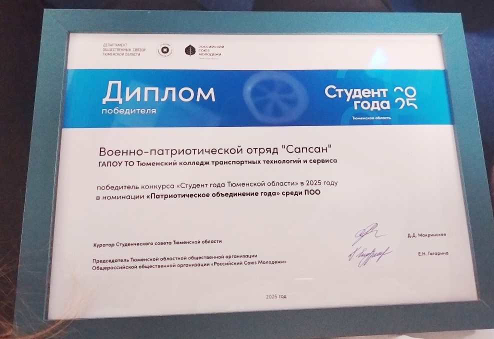 Военно-патриотический отряд «Сапсан» был удостоен высшей награды и получил диплом ПОБЕДИТЕЛЯ в номинации «Патриотическое объединение года»! Это звание – настоящий результат колоссальной работы, преданности и сплоченности нашего отряда.