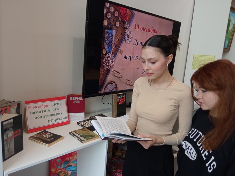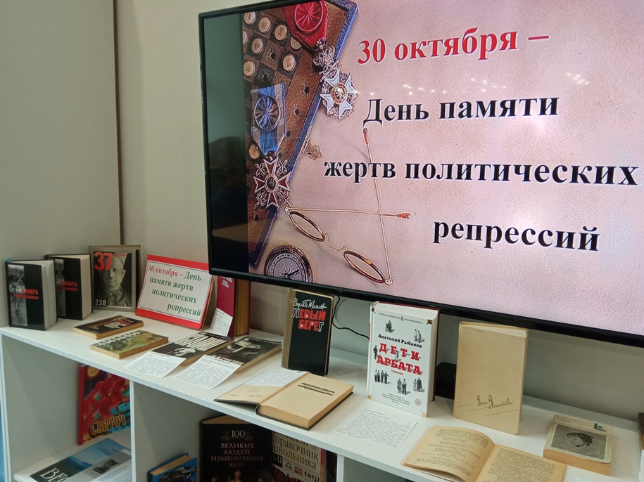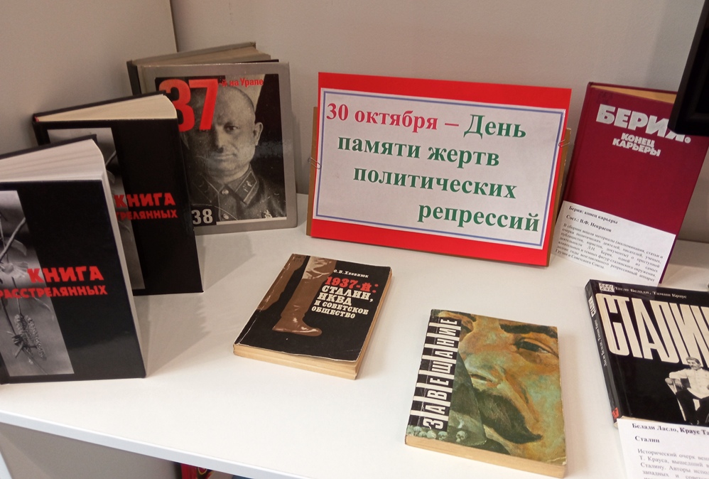 Ко Дню памяти жертв политических репрессий в библиотеке работает книжная выставка-напоминание «Трагедия народа в памяти поколений», на которой представлена документальная литература и произведения писателей и поэтов, которые сами побывали в жерновах репрессий, рассказывающие об этой трагической странице в истории нашей страны.