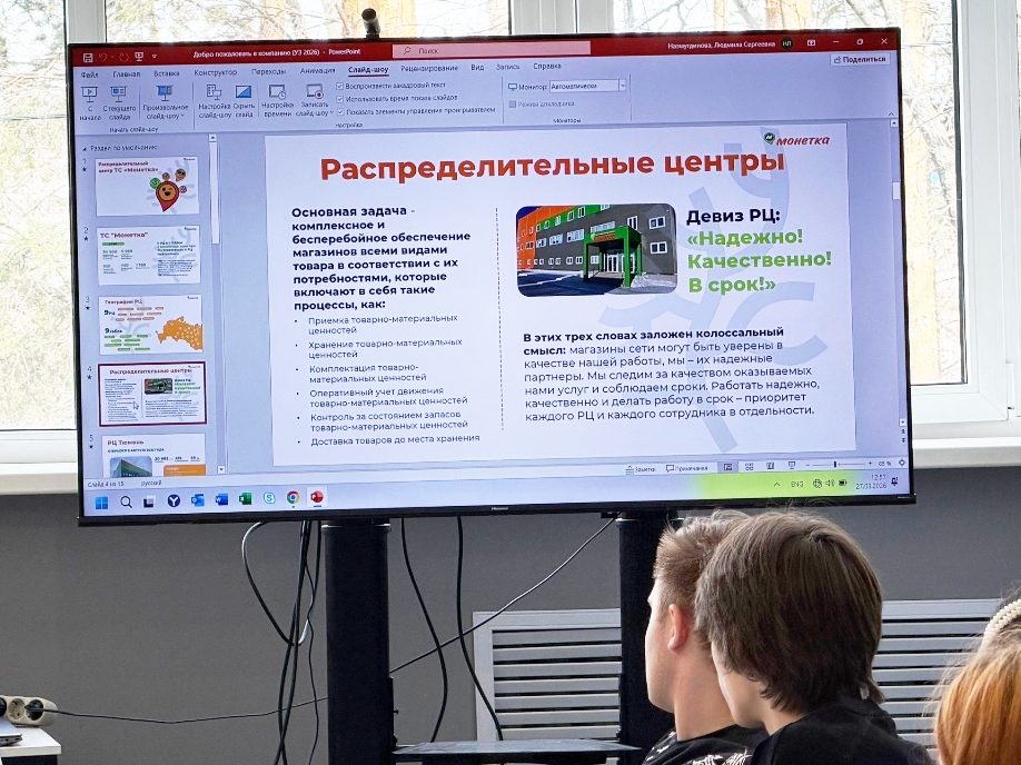 Сотрудники РЦ торговой сети «Монетка» провели презентацию компании и рассказали об особенностях работы распределительного центра, ответили на вопросы о трудоустройстве и профессиональном росте на производстве, рассказали о востребованных навыках для начинающих логистов.