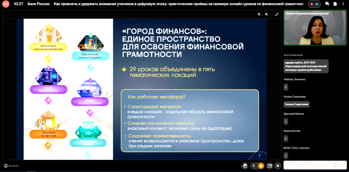 Вебинар был посвящен методическим основам и практической ценности игр. Педагоги узнали, как с помощью игровых механик отрабатывать навыки ведения бюджета, грамотного сбережения и ответственного кредитования для разных возрастных групп. Главный практический ресурс, который теперь в арсенале наших преподавателей — платформа «Игры по финансовой грамотности». - «Как привлечь и удержать внимание учеников в цифровую эпоху»
