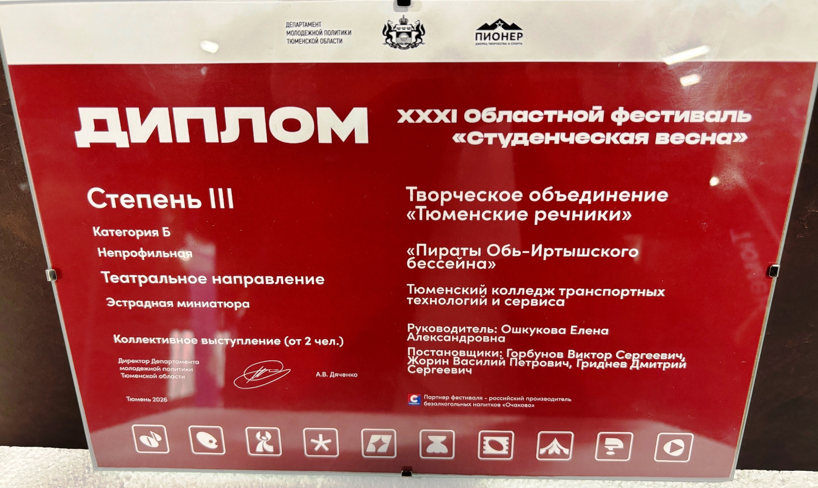 - Диплом 3 степени — творческое объединение «Тюменские речники», «Эстрадная миниатюра» — «Пираты Обь-Иртышского бассейна».