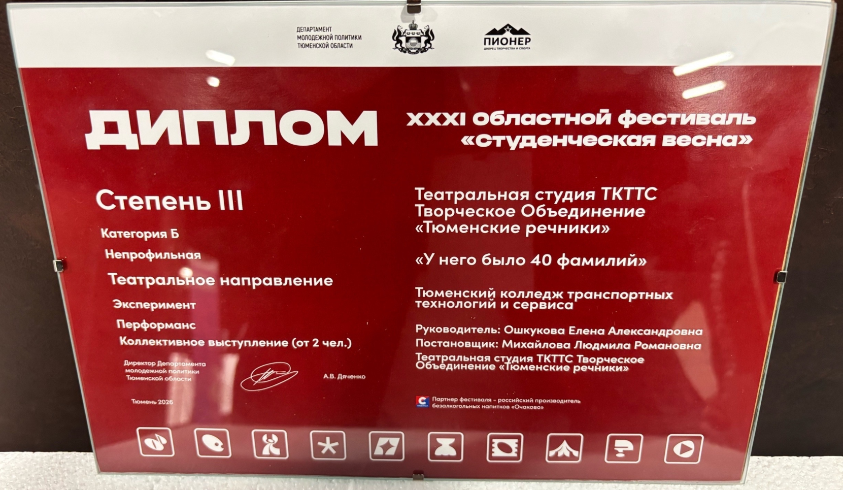 - Диплом 3 степени — творческое объединение «Тюменские речники», «Перфоманс»- «У него было 40 фамилий».
