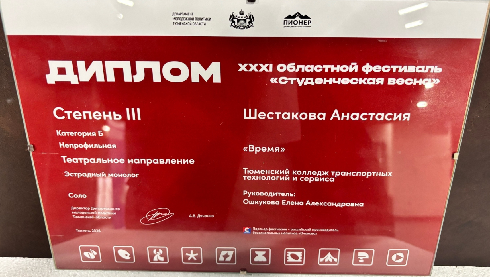 - Диплом 3 степени – «Эстрадный монолог», Шестакова Александра — «Время».