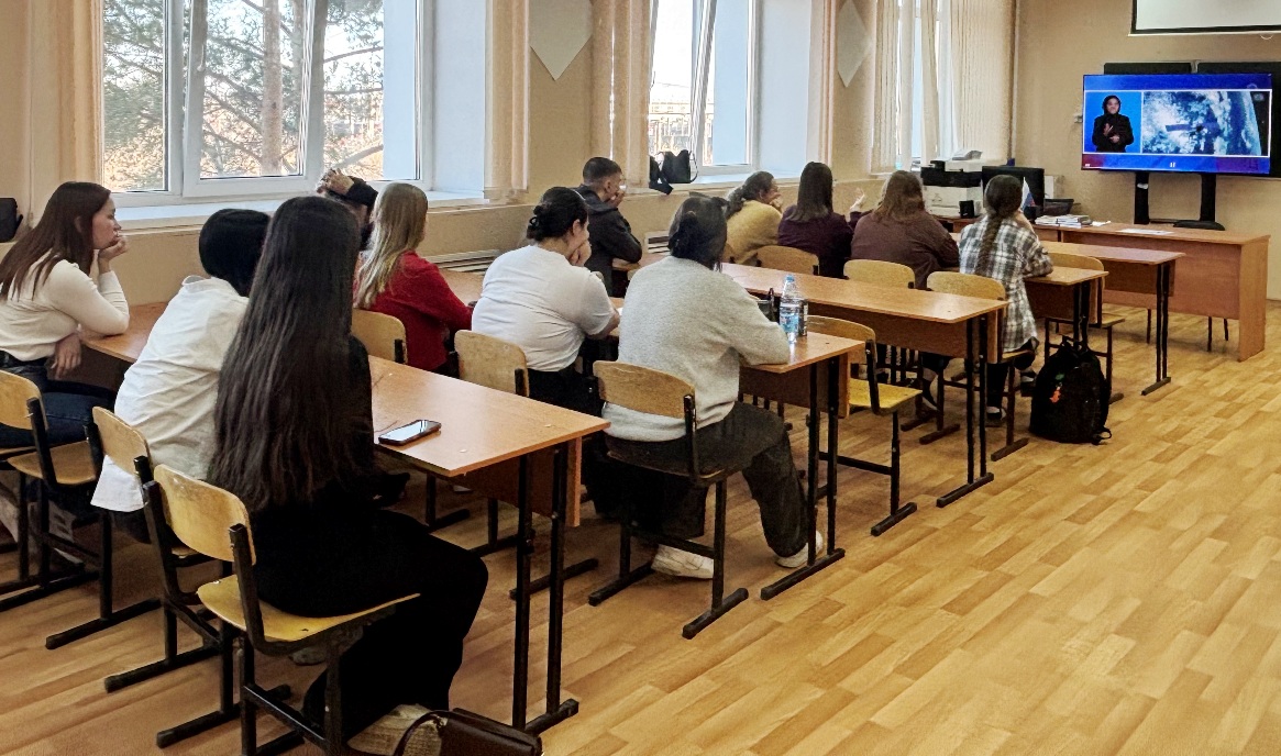 Студенты вместе с кураторами посмотрели видеоролик «Зачем нам космос, если мы живем на Земле?» — короткий, но емкий фильм, который помог задуматься о том, что космические исследования меняют нашу повседневную жизнь: от связи и навигации до медицины и метеорологии.
