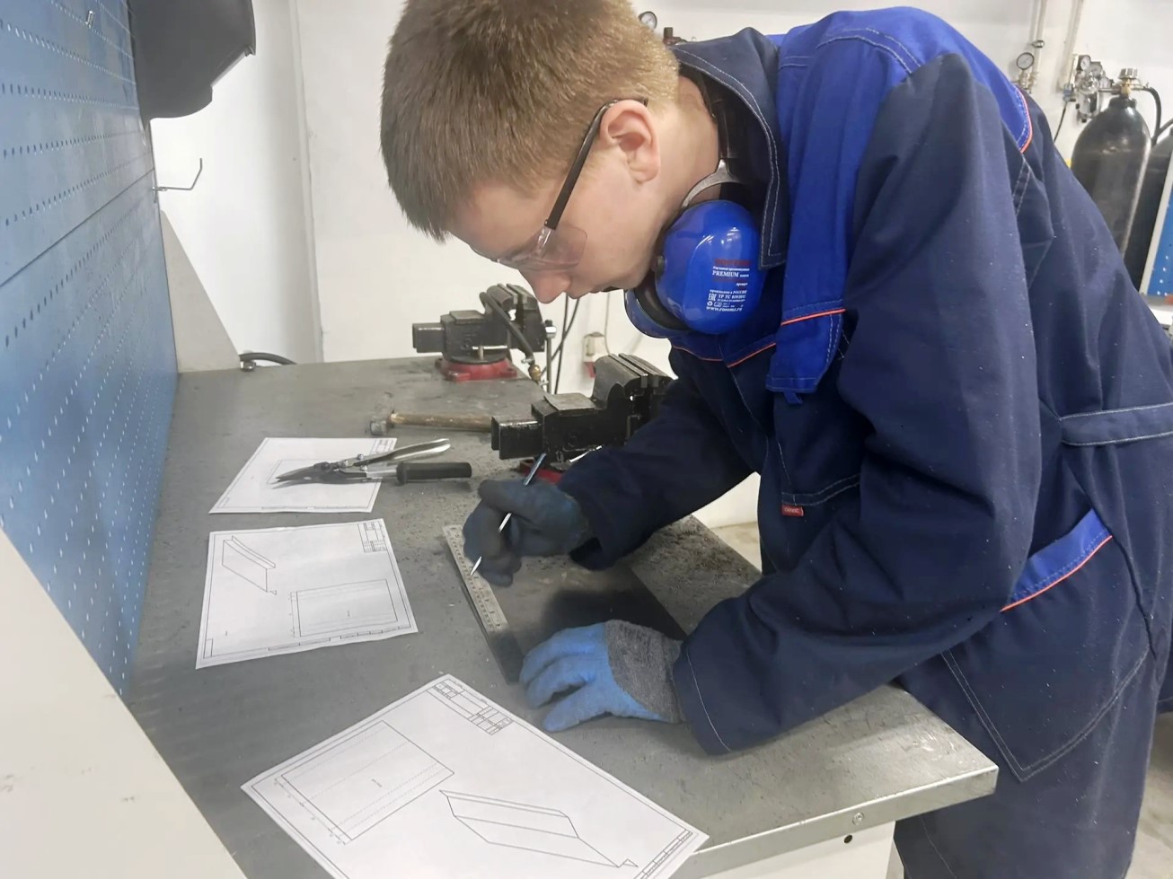 Участникам профессиональной пробы по основам кузовного ремонта предстояло выполнить разметку и резку при работе с тонколистовым металлом. Перед началом работы школьники прошли вводный инструктаж по охране труда и технике безопасности при выполнении жестяницких работ. Ознакомились с измерительными инструментами жестянщика, видами ручного режущего, рихтовочного, клепального инструмента и особенности его применения и обслуживания. Под чутким руководством наставника, школьники успешно справлялись с выполнением поставленной задачи. Приобретенный опыт работы с инструментами и металлом вызвал у школьников интерес к освоению профессии «Мастер по ремонту и обслуживанию автомобилей».