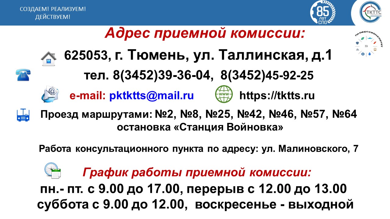 625053, г. Тюмень, ул. Таллинская, д. 1, ГАПОУ ТО «ТКТТС» - приемная комиссия
