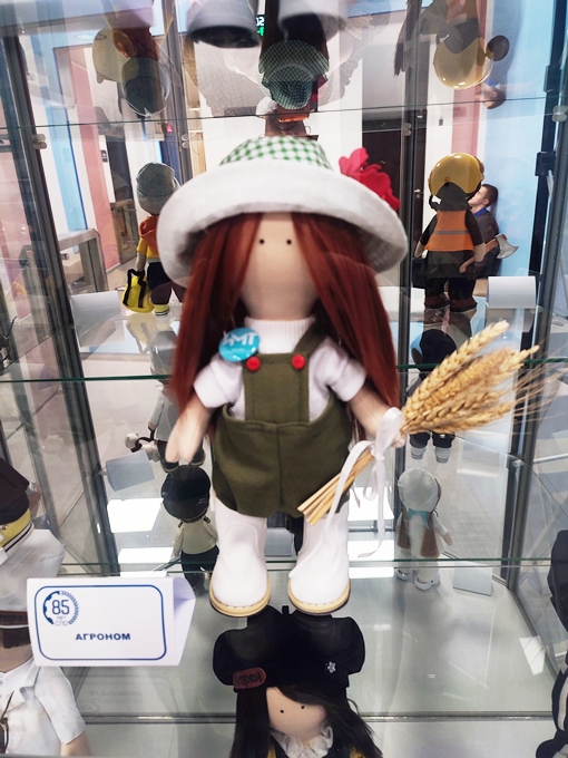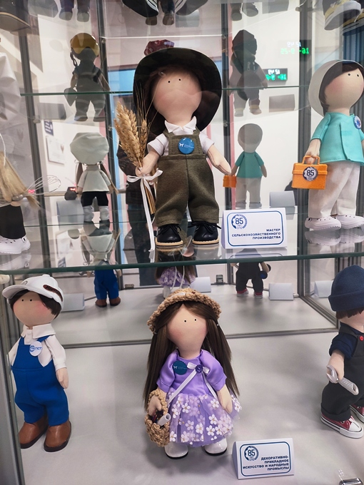 Экспозиция начинается с раздела о трансформации традиционных профессий под влиянием цифровизации, который дополняют куклы — Мастеряши — официальные талисманы регионального конкурса «Мастер года-2024».