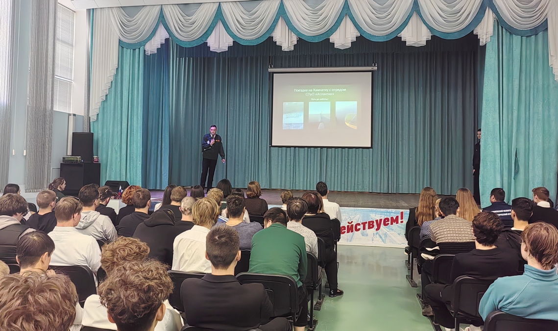 В нашем колледже есть такие парни, которые уже не в первый раз отправляются покорять Камчатку и Сахалин в качестве бойцов студенческих путинных отрядов. Путинные отряды входят в направление «Студенческие сельскохозяйственные отряды» и участвуют в полном цикле переработки рыбы: от погрузки и очистки до упаковки икры. Да, они были там этим летом! Подробности этого интересного путешествия рассказал командир отряда «Атлантик» Жданов Александр, командир отряда «Кречет» Шевченко Сергей и командир штаба отрядов ТКТТС Корчемкин Дмитрий. Ребята поделились своими успехами и эмоциями, которые их переполняли. Не секрет, что бойцы путинных отрядов привозят с собой самые большие заработки. Самый большой заработок бойца за лето составил – 410 тысяч рублей, но это еще не предел. Присутствующие на мероприятии имели возможность даже попробовать свежую красную икру с Камчатки!!