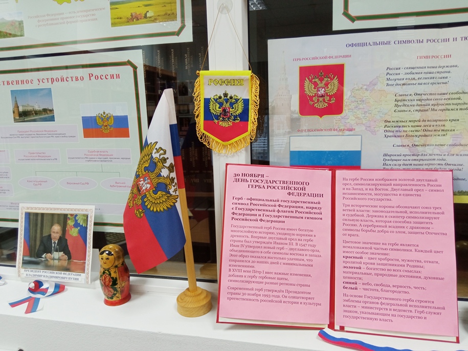 - «Символы России – история страны» — постоянная выставка-показ. Разделы в ноябре: «История государства российского», посвященная Дню народного единства (4 ноября), «30 ноября – День государственного герба Российской Федерации»;