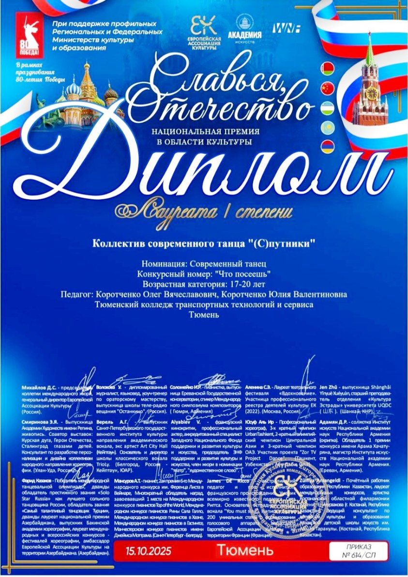Подведены итоги национальной премии в области культуры «Славься, Отечество». Осенью 2025 года в номинации «Современный танец» танцевальный коллектив нашего колледжа «Спутники» был удостоен высшей награды — звания Лауреата I степени.