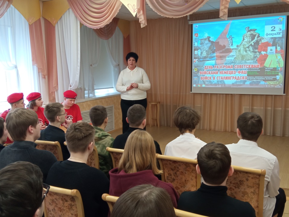 В музейной гостиной на встрече «Горящий Сталинград» гостям рассказали, что 2 февраля в России отмечается День воинской славы — День разгрома советскими войсками немецко-фашистских войск в Сталинградской битве (1943 год), показали очень захватывающее видео «Как Сталинградская битва изменила ход Второй Мировой войны» и обратили внимание на ряд интересных фактов из истории Сталинградской битвы.