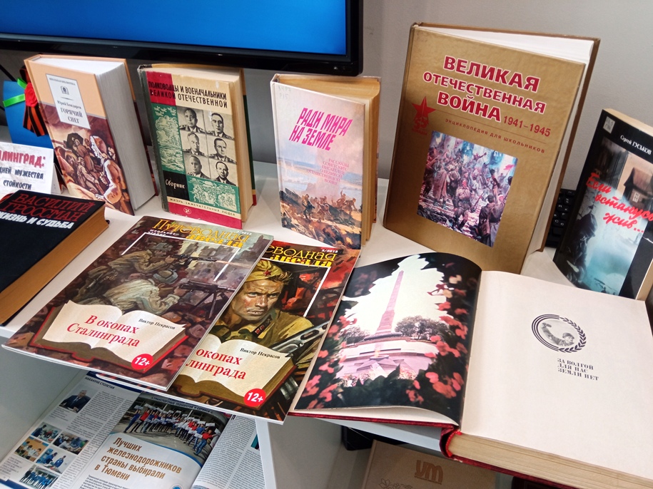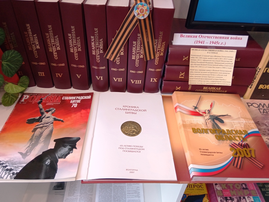 Об истории Великой Отечественной войны и хронике Сталинградской битвы, о героическом подвиге героев-освободителей можно узнать из материалов выставки: документальные, исторические, публицистические сборники: «Поля ратной славы», «Город герой – Волгоград», «Полководцы и военачальники Великой Отечественной», «Летописцы Победы», «Венок славы» (4 том), многотомный труд «Великая Отечественная война 1941 – 1945», энциклопедия «Великая Отечественная война».