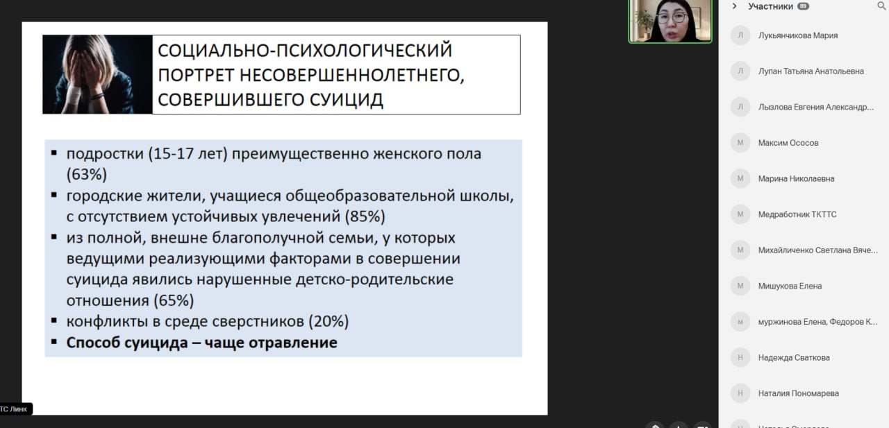 В целях повышения психологической грамотности и формирования безопасной образовательной среды для сотрудников и педагогов был организован специализированный онлайн-семинар. Перед коллективом выступила практикующий специалист в области психологического здоровья, психолог Центра суицидальной превенции ГБУЗ ТО «Областная клиническая психиатрическая больница» Айжана Валерьевна Исымканова.