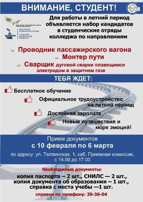 Дорогие студенты! В рамках реализации мероприятий временной занятости студентов в летний период объявляется набор кандидатов в студенческие отряды колледжа по направлениям: