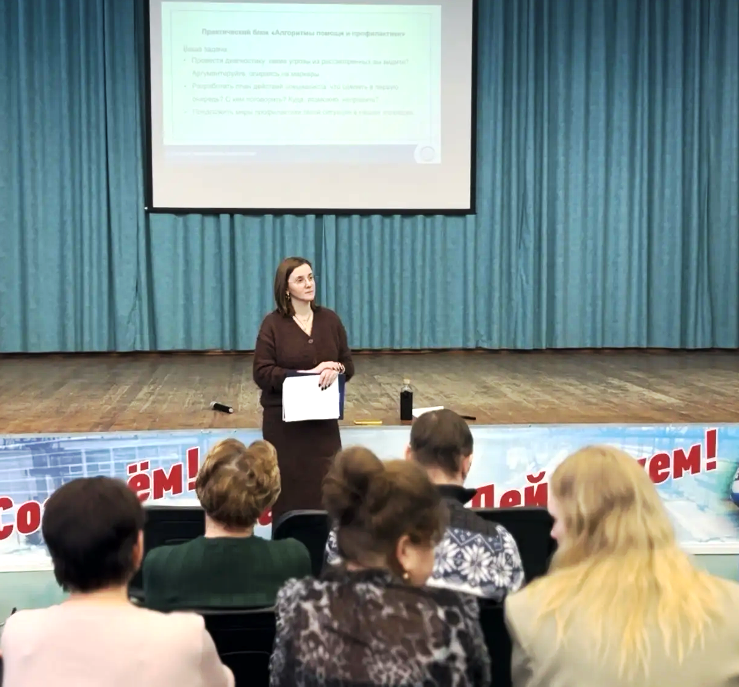Важной частью процесса обучения является процесс воспитания обучающихся. После отработки трудовых функции коллектив включился в работу второго блока мероприятия. Заместитель директора по социально-педагогической работе Ашихмина Анна Александровна провела лекцию «Профессиональный стандарт в контексте воспитательной работы», а затем была организована работа в группах по решению кейсов.