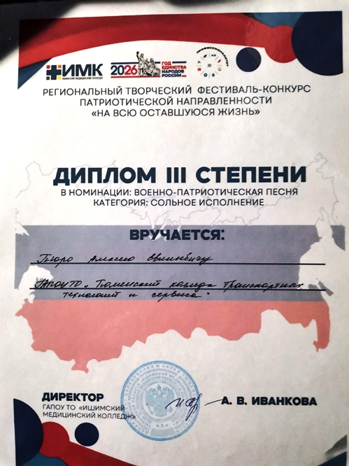 19 февраля в городе Ишиме состоялся региональный творческий фестиваль-конкурс патриотической направленности «На всю оставшуюся жизнь». Организатором мероприятия выступил ГАПОУ ТО «Ишимский медицинский колледж».