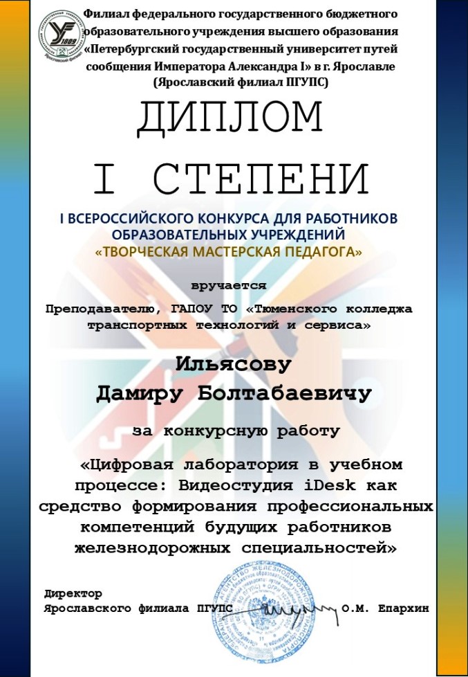 Рады сообщить, что Ильясов Дамир Болтабаевич занял 1‑е место с работой «Цифровая лаборатория в учебном процессе: Видеостудия iDesk как средство формирования профессиональных компетенций будущих работников железнодорожных специальностей».