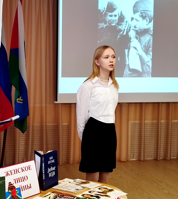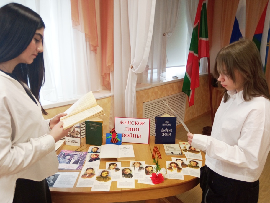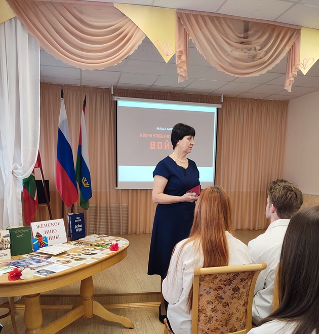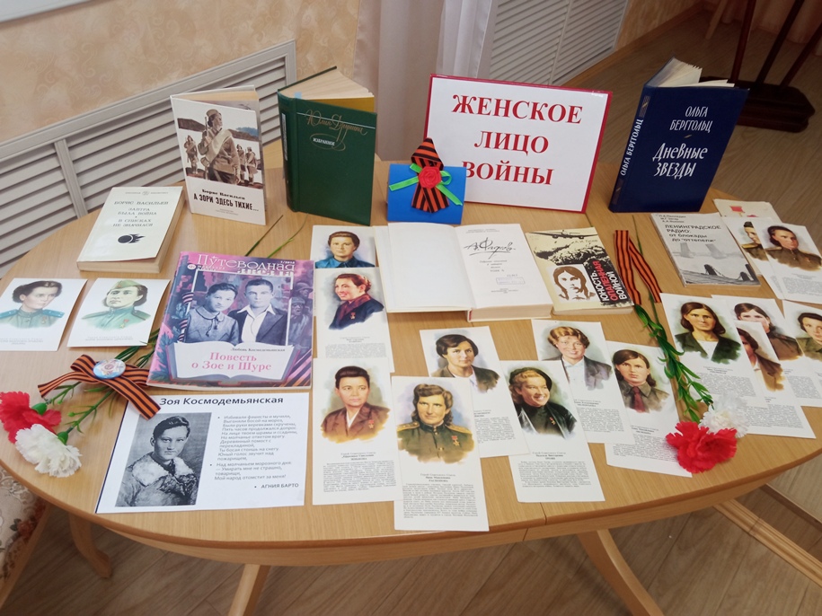 В рамках урока памяти Надежда Владимировна Петрова организовала передвижную тематическую выставку «Женское лицо войны», на которой представлены лучшие художественные произведения о женщинах-защитниках времен Великой Отечественной войны. Книги: Борис Васильев «А зори здесь тихие…», «Завтра была война», Александр Фадеев «Молодая гвардия», А. Гусев «Юность, опаленная войной», Любовь Космодемьянская «Повесть о Зое и Шуре», стихи Юлии Друниной и Ольги Бергольц, художественные открытки с краткой информацией «Женщины – герои Советского союза».