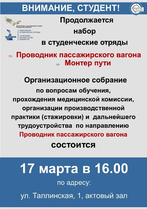 Организационная встреча по вопросам обучения, прохождения медицинской комиссии, организации производственной практики (стажировки) и дальнейшего трудоустройства по направлению «Проводник пассажирского вагона» состоится 17 марта в 16.00 по адресу: ул. Таллинская, 1, актовый зал.