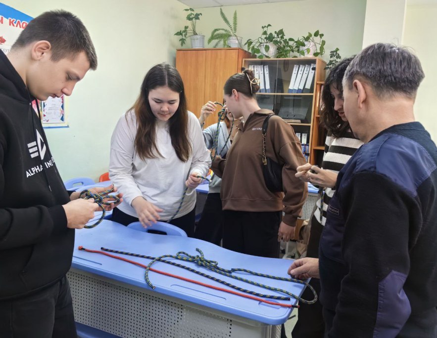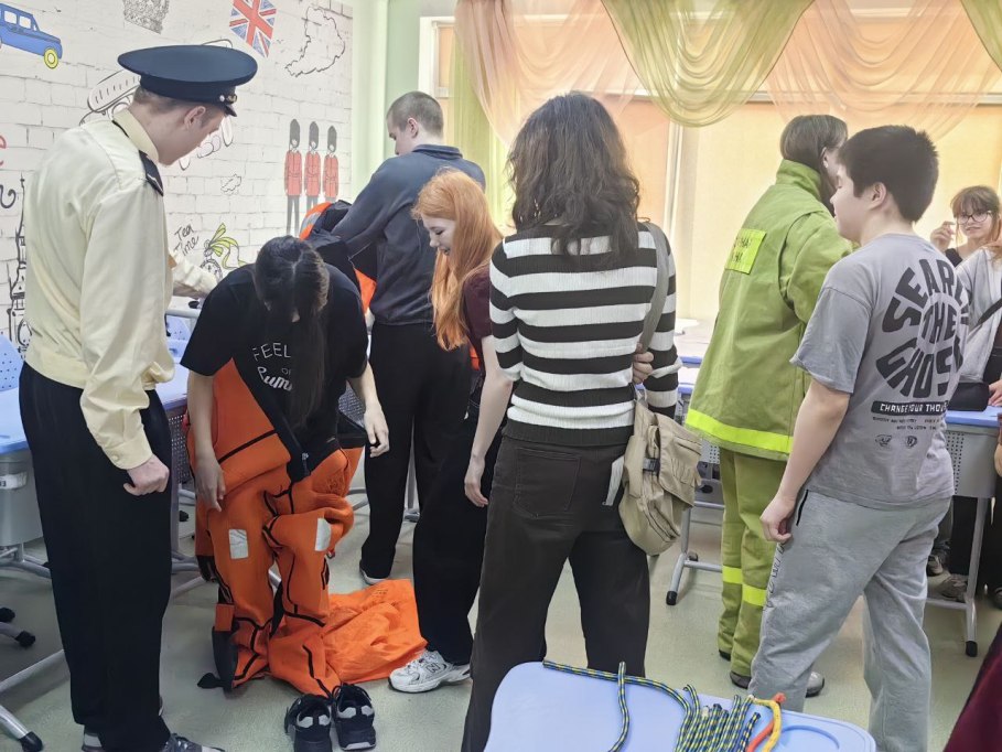 - Мастер-класс «Борьба за живучесть на судне» — школьники познакомились со средствами индивидуальной защиты на судне их назначение, примерили костюмы СИЗ, получили навыки плетения морских узлов.