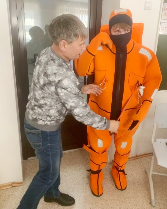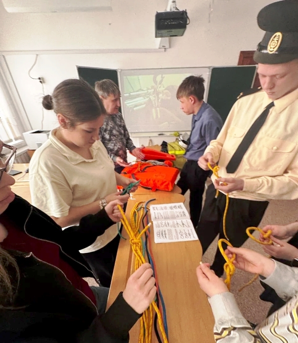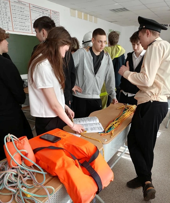 С помощью видеофильма о мастерской «Тренажерный центр по борьбе за живучесть» школьники узнали о профессиях водного транспорта, познакомились со средствами индивидуальной защиты на судне и их назначение. С интересом примеряли костюмы СИЗ, научились вязать морские узлы.