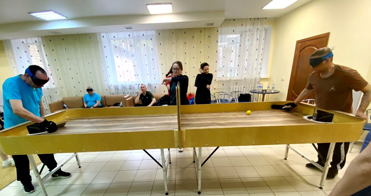 Спортсмены соревнуются в особой дисциплине, объединяющей элементы настольного тенниса и аэрохоккея. Для игры используются специальная ракетка, мяч со встроенными стальными шариками (позволяет ориентироваться на слух), защитная перчатка (предохраняет руку от ударов) и светонепроницаемые маски (обеспечивают равные условия для всех участников).
